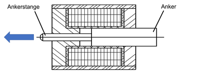 Das Bild zeigt den prinzipiellen Aufbau eines Elektromagneten, speziell eines Hubmagneten in der unbestromten Ausgangslage. Bei Bestromung bewegen sich Anker und Ankerstange in Richtung des Pfeiles.