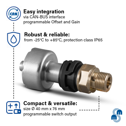 The linear, inductive transducer with CAN-BUS sets new standards for precision and efficiency. With compact dimensions of Ø40mm x 76mm, it offers maximum flexibility with a measuring stroke of ±4 mm, an integrated CAN-BUS interface and an additional analogue output. Thanks to its programmable switch output, 100% temperature compensation during EOL testing and a temperature range from -25°C to +85°C, it is equipped for even the most demanding environments. The IP65 protection class and reverse polarity-protected sensor input ensure maximum operational reliability.
